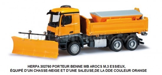 PORTEUR BENNE MB AROCS M,3 ESSIEUX, ÉQUIPÉ D'UN CHASSE-NEIGE ET D'UNE SALEUSE,DE LA DDE COULEUR ORANGE "SERVICE D'HIVER"