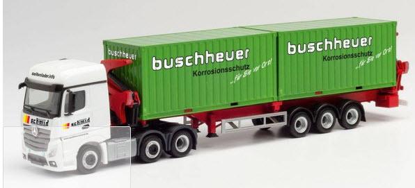 TRACTEUR MB ACTROS BLANC AVEC SEMI-REMORQUE PORTES CONTAINER 2 DE 20 PIEDS VERT BUSCHHEUER