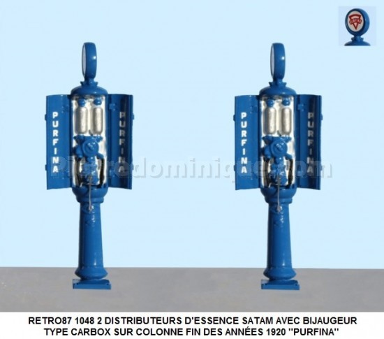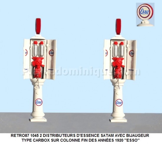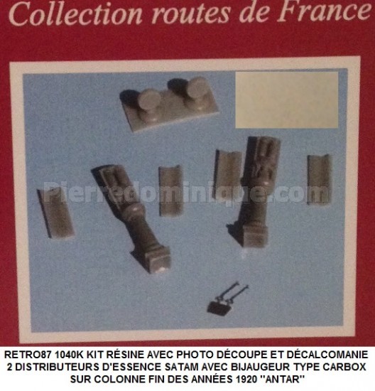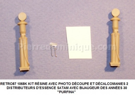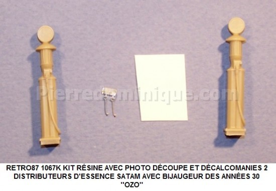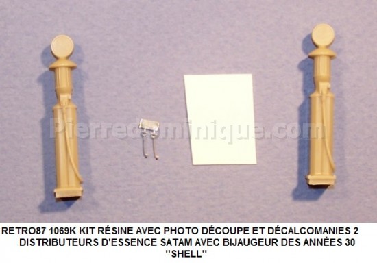 KIT RÉSINE AVEC PHOTO DÉCOUPE ET DÉCALCOMANIES 2 DISTRIBUTEURS D'ESSENCE SATAM AVEC BIJAUGEUR TYPE CARBOX SUR COLONNE FIN DES ANNÉES 1920 ''SHELL''