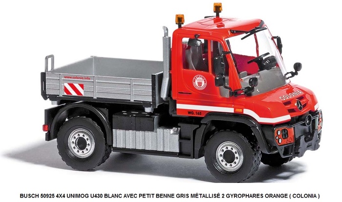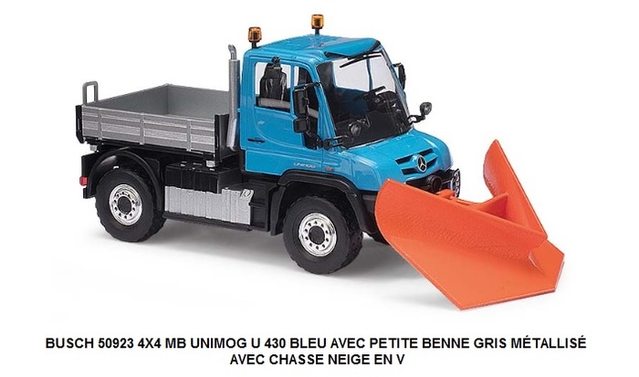 4X4 MB UNIMOG U 430 BLEU AVEC PETITE BENNE GRIS MÉTALLISÉ AVEC CHASSE NEIGE EN V