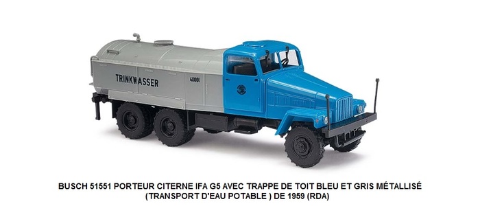 PORTEUR CITERNE IFA G5 AVEC TRAPPE DE TOIT BLEU ET GRIS MÉTALLISÉ (TRANSPORT D'EAU POTABLE ) DE 1959 (RDA)
