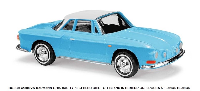 VW KARMANN GHIA 1600 TYPE 34 BLEU CIEL TOIT BLANC INTERIEUR GRIS ROUES À FLANCS BLANCS