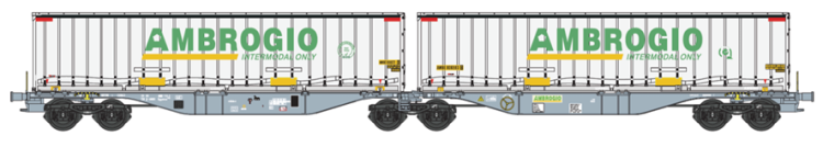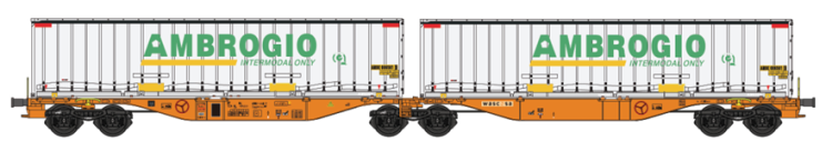 DOUBLE WAGON PORTE CONTENEURS SGGMRS + 2 CONTENEURS AMBROGIO CH-WASCOSA (A RESERVER)